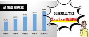 成人の8割は歯周病に感染していると言われ、やや進行した歯周病の歯(歯周ポケット4mm以上)がある人の割合は、55歳以上で50%以上の割合となっています。