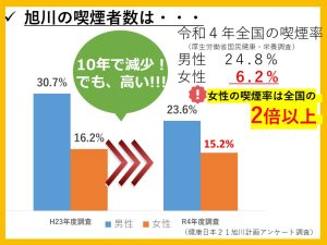 このようなたばこ対策が進む中で、旭川市の喫煙率は男女ともに10年で減少しています。しかし、女性の喫煙率は全国の2倍以上となっており、男性の喫煙率も全国よりは低いものの、更なる減少を目指したいですね。