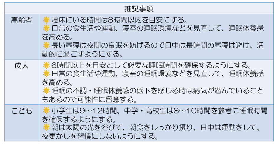 厚生労働省では健康日本21(第三次)における休養・睡眠分野の取組を推進するため、「健康づくりのための睡眠ガイド 2023」を公表しています。ガイドでは以下の対象別に良質な睡眠の確保のために推奨される事項がまとめられています。