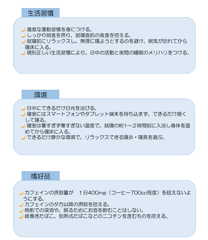 それでも生活をする上で支障をきたす睡眠の悩みが続く場合、治療を要する疾患が隠れていることもありますので、かかりつけ医や精神科、心療内科などの医療機関への相談をお勧めします。
