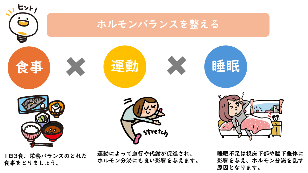 ポイント① 食事食事は適量にしましょう。やせすぎ、太りすぎはホルモンバランスを崩す原因になります。
