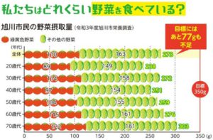旭川市民の1日あたりの野菜の摂取量は,平均273gで,目標の350gには77g不足しています。毎日の食事に野菜をあと1皿増やしてみませんか?